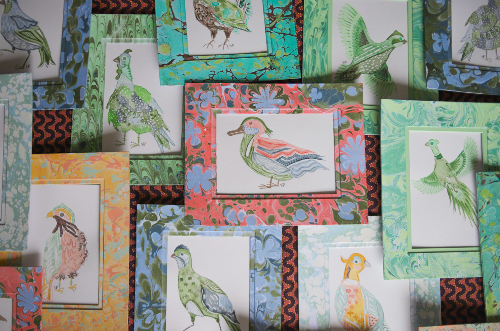 Select birds are paired with accompanying hand-watercolored mattes and are handcrafted, making each one unique.